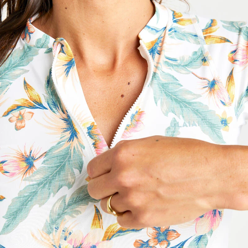 Nous, surfeuses de tous niveaux, avons conçu ce tee shirt anti UV pour la surfeuse confirmĂ©e qui surfe les vagues de moins d’un mètre.Tee shirt anti-UV manches longues pour protĂ©ger du soleil, mĂŞme dans l’eau, et limiter les irritations au contact de la planche. NĹ“uds latĂ©raux d’attache du maillot pour la tenue dans la vague.